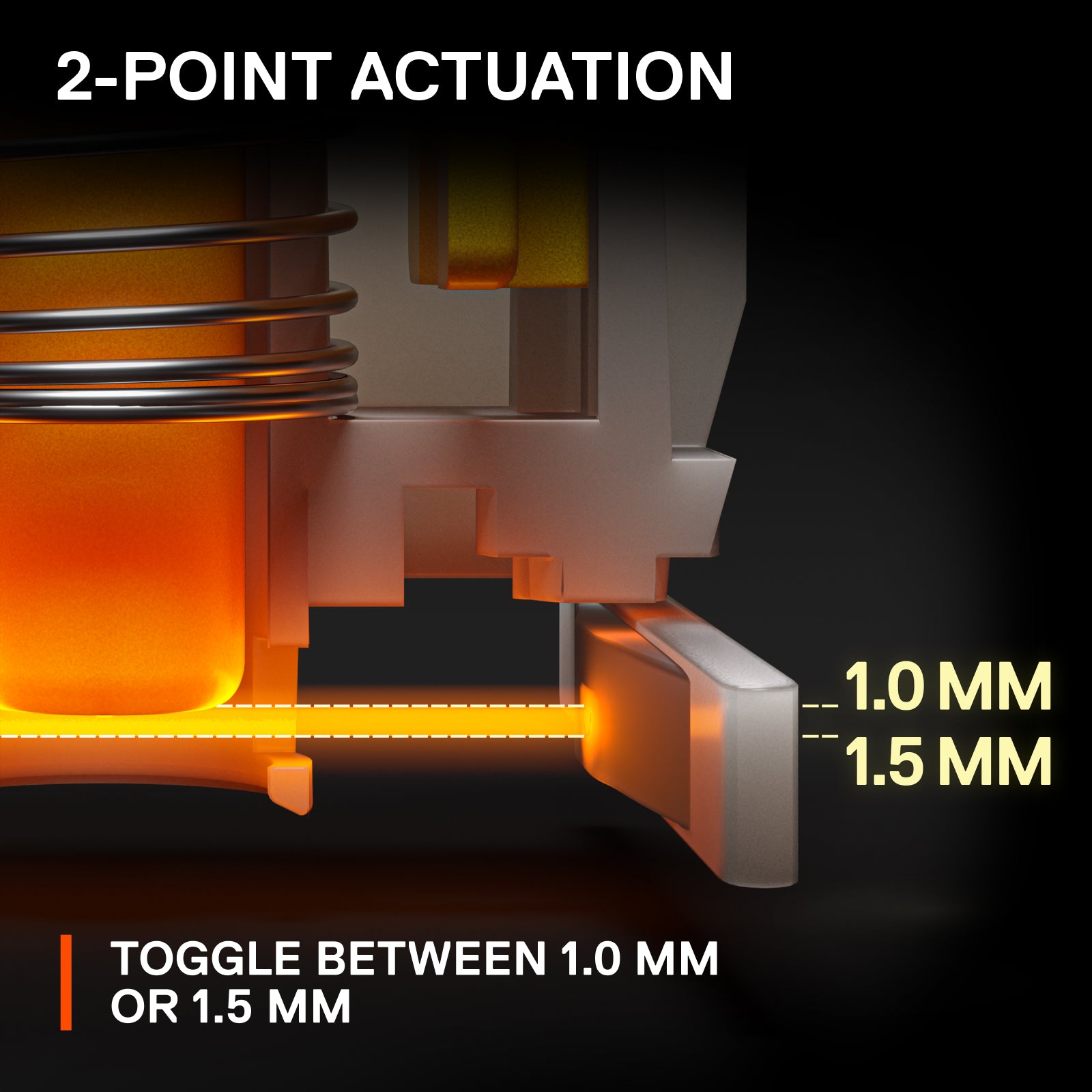 Apex 9 har SteelSeries’ OptiPoint optiske kontakter til hurtig og præcis respons. Takket være 2-punktsbetjening kan du ændre registreringsdybden fra 1 mm til en mere præcis 1,5 mm registreringsdybde. Sammen med dobbeltskuds-PBT-tastehætter får du hårdfør og komfortabel tastning.